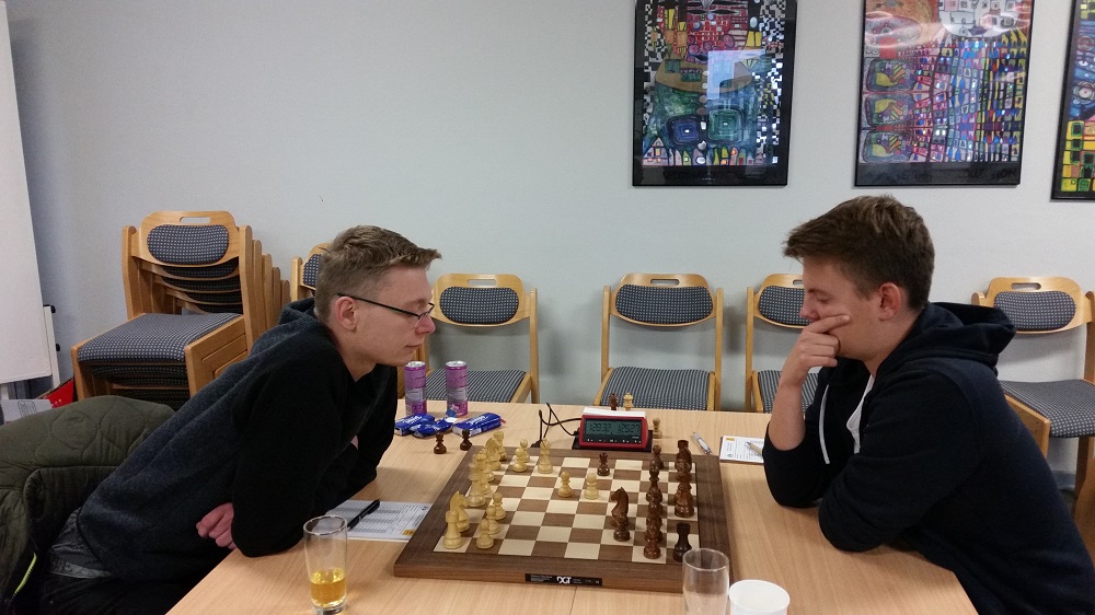 In einem spannenden Spitzenspiel schenkten sich die Topgesetzten Hugo Post und Johannes Paul nichts und kämpften in der längsten Partie der Runde ein korrektes Remis aus.