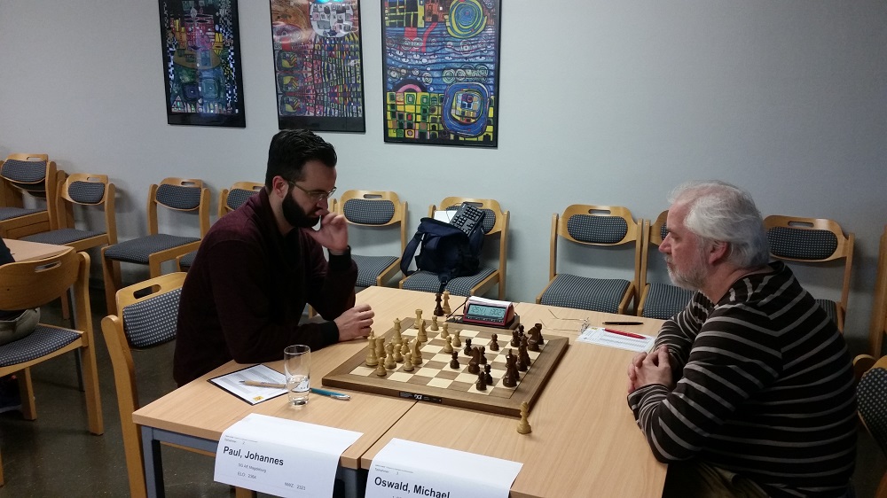 Hugo Post verpasste die Chance zum Dreikampf an der Spitze in seiner Partie gegen Michael Oswald. Nach interessanter Eröffnung mit vielen taktischen Möglichkeiten entstand eine für Schwarz vorteilhafte Stellung. Im späteren Endspiel gab es dann auch einige Gewinnmöglichkeiten, aber in unübersichtlicher Lage verdarb Hugo die Stellung noch zum Verlust.